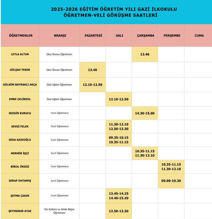 Öğrencilerimizin akademik ve sosyal gelişimlerini yakından takip edebilmeniz için öğretmenlerimizin veli görüşme saatleri planlanmıştır. Siz değerli velilerimiz, belirtilen gün ve saatlerde öğretmenlerimizle görüşme sağlayarak öğrencimizin eğitim sürecine katkıda bulunabilirsiniz.